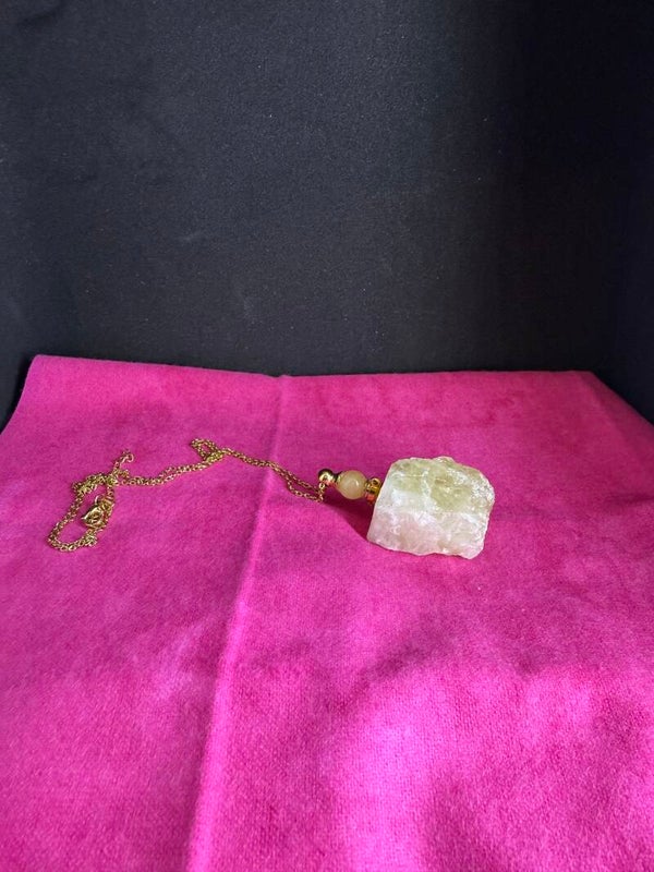 Beautiful green quartz piece made into a perfume bottle that works. This would be perfect to wear over a sweater. The chain is 20 inches and covered in gold tone. There is a two-inch extender bring it to 22 inches if needed. A beautiful quartz bead is on the top and can be turned to open. Use an eyedropper to fill with perfume.