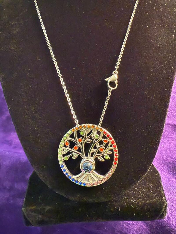 20 inch Stainless Steel Tree of Life Necklace. The pendant brings the necklace to 22 inches. The pendant is 1 and 1/4 inches. Multi gemstones go around the pendant. A beautiful stone is bezel set in the tree.